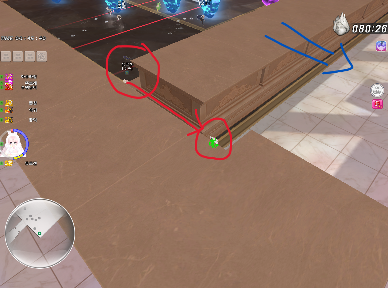 원래는 왼쪽 원 안에 있어야 되는데, 시작하자마자 모서리 부분에 대쉬를 쓰며 벽에 비비니 갑자기 통과되면서 바깥으로 와졌다.